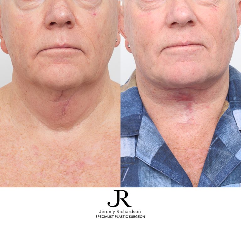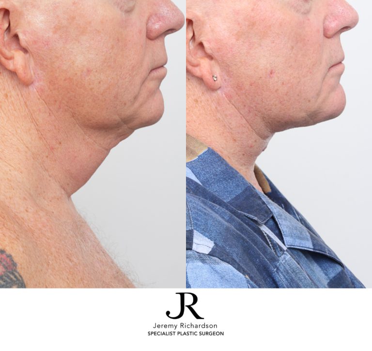 There are a number of surgical techniques for neck lifts. Generally, Dr Richardson makes small incisions under the chin and behind or in front of each ear. Through these incisions, the muscles are tightened and fixed in place with strong internal sutures. Any excess tissue is pulled and removed to eliminate skin folds and wrinkles. We can also combine the procedure with liposuction to reduce any fat deposits. Finally, Dr Richardson closes the incisions.